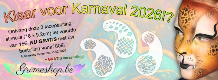 Tot en met 11/02/2026 ontvangt u bij uw bestelling vanaf 80€ GRATIS 3 facepainting stencils om een leuke textuur te geven aan uw werk. Luipaardvlekken, mini tijgerlijnstructuren en ook nog druppels en schubben.